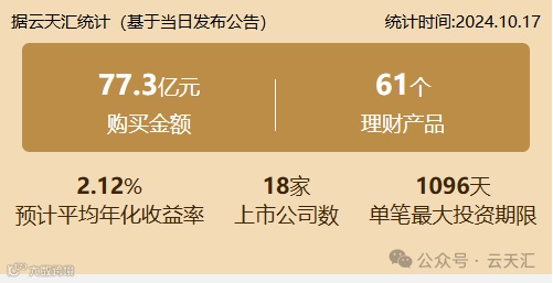 2024年10月17日,上市公司购买理财金额77.3亿元,共18家上市公司,理财产品61个。