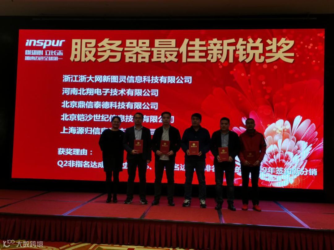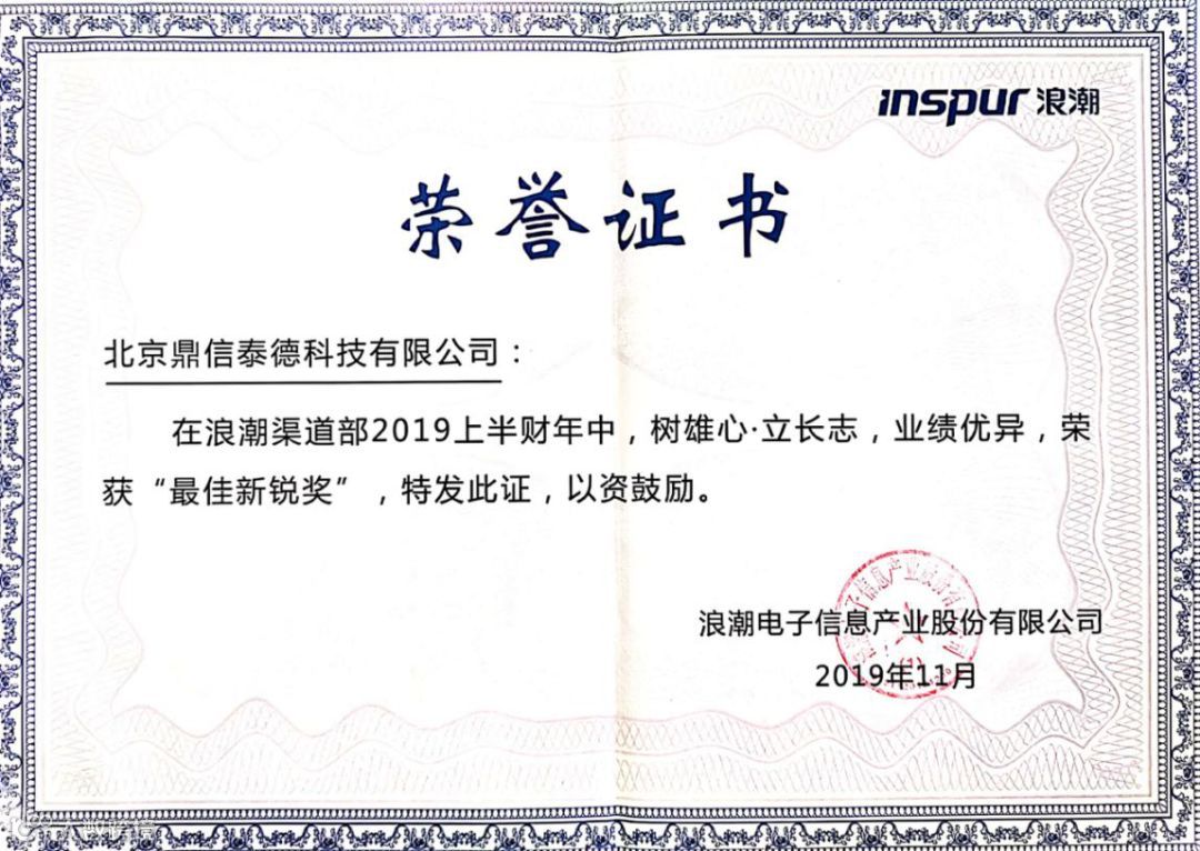 北京鼎信泰德科技有限公司自2019年8月成为浪潮北京区新晋分销商,9月成功举办了一场浪潮&鼎信渠道招募会,不断地挖掘开发浪潮客户资源,目前已绑定73家二级渠道,销售业绩也有质的飞跃,在2019年11月参加浪潮渠道半年总结会中,业绩优异,获得了“最佳新锐奖”荣誉证书。浪潮&鼎信泰德在未来还会不断举办渠道招募会以及培训会,与渠道伙伴携手,同进步共发展,开启浪潮IT建设新局面。
