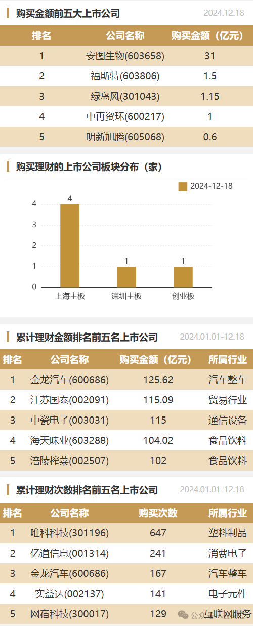 2024年12月18日,上市公司购买理财金额35.7亿元,共6家上市公司,理财产品26个。