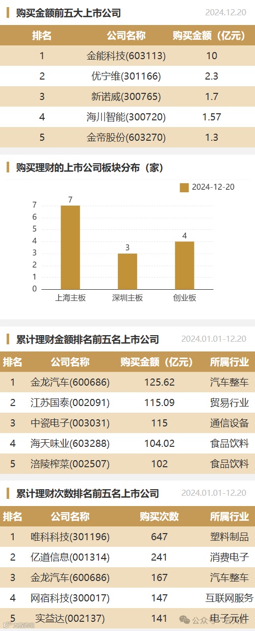 2024年12月20日,上市公司购买理财金额22.71亿元,共14家上市公司,理财产品25个。