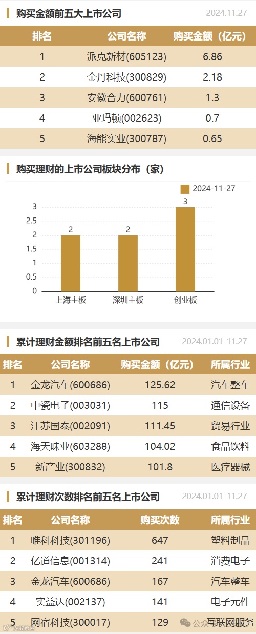 2024年11月27日,上市公司购买理财金额12.09亿元,共7家上市公司,理财产品18个。
