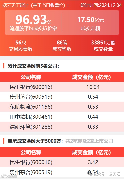 2024年12月4日,大宗交易成交金额17.50亿元,交易股票数56只,成交笔数86笔,流通股平均成交折价率96.93%,成交数量3.39亿股。
