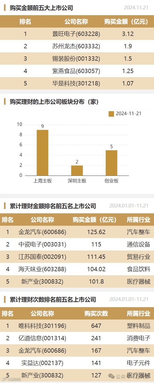 2024年11月21日,上市公司购买理财金额13.39亿元,共16家上市公司,理财产品31个。