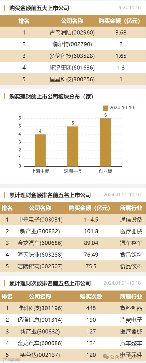 2024年10月10日,上市公司购买理财金额16.25亿元,共15家上市公司,理财产品32个。