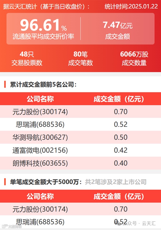 2025年1月22日,大宗交易成交金额7.47亿元,交易股票数48只,成交笔数80笔,流通股平均成交折价率96.61%,成交数量0.6亿股。
