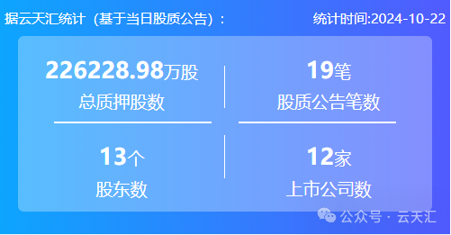 2024年10月22日,股票质押总质押股数22.62亿股,上市公司数12家,股质公告笔数19笔,股东数13个。