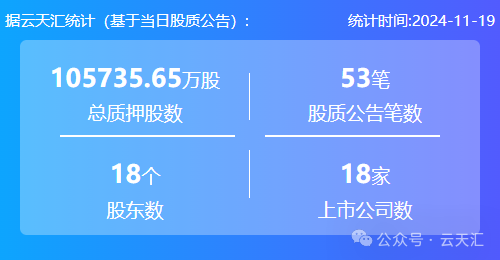 2024年11月19日,股票质押总质押股数10.57亿股,上市公司数18家,股质公告笔数53笔,股东数18个。