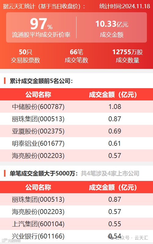 2024年11月18日,大宗交易成交金额10.33亿元,交易股票数50只,成交笔数66笔,流通股平均成交折价率97%,成交数量1.28亿股。