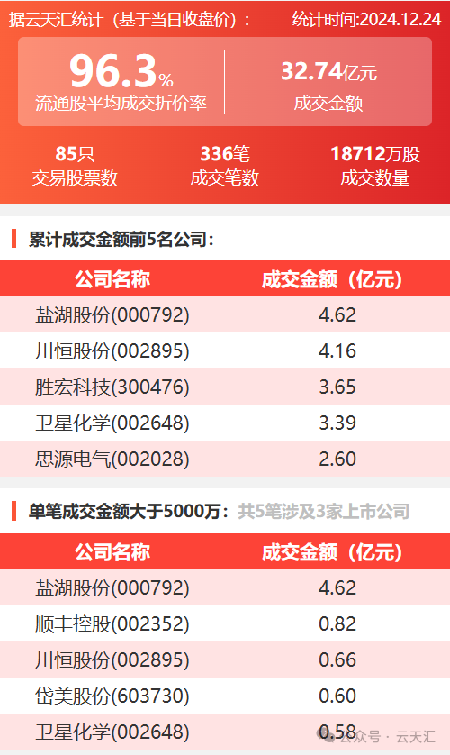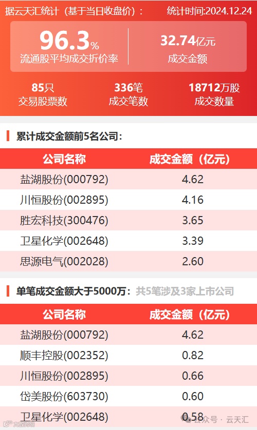 2024年12月24日,大宗交易成交金额32.74亿元,交易股票数85只,成交笔数336笔,流通股平均成交折价率96.3%,成交数量1.87亿股。