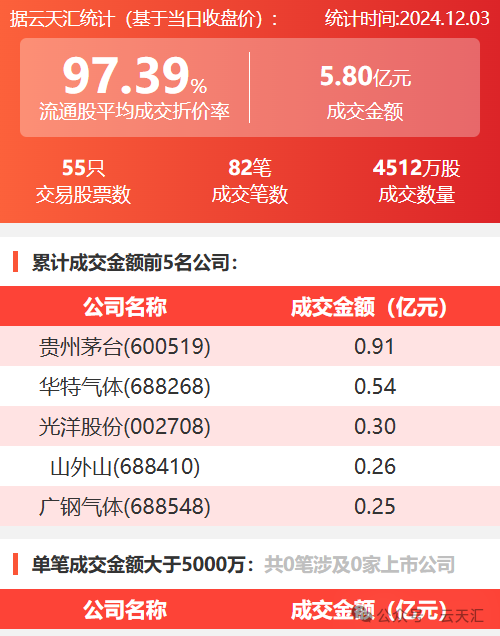 2024年12月3日,大宗交易成交金额5.8亿元,交易股票数55只,成交笔数82笔,流通股平均成交折价率97.39%,成交数量0.45亿股。