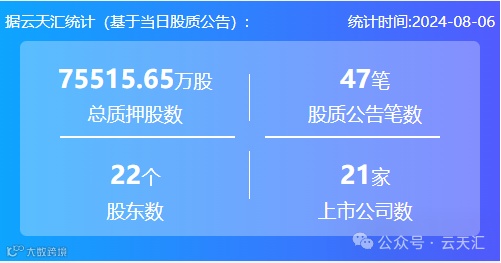 2024年8月6日,股票质押总质押股数7.55亿股,上市公司数21家,股质公告笔数47笔,股东数22个。
