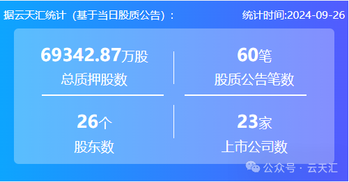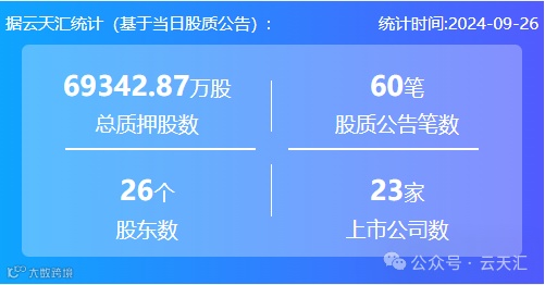 2024年9月26日,股票质押总质押股数6.93亿股,上市公司数23家,股质公告笔数60笔,股东数26个。