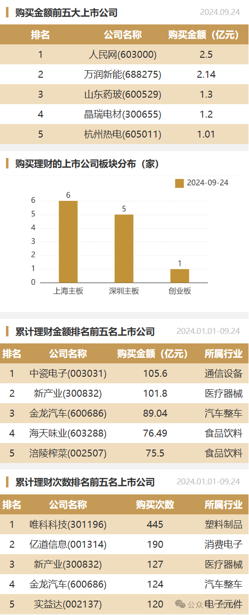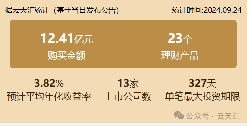 2024年9月24日,上市公司购买理财金额12.41亿元,共13家上市公司,理财产品23个。