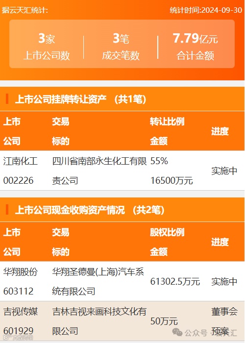 2024年9月30日,资产交易成交金额7.79亿元,上市公司3家,成交3笔,上市公司挂牌转让资产1笔,现金收购资产2笔。