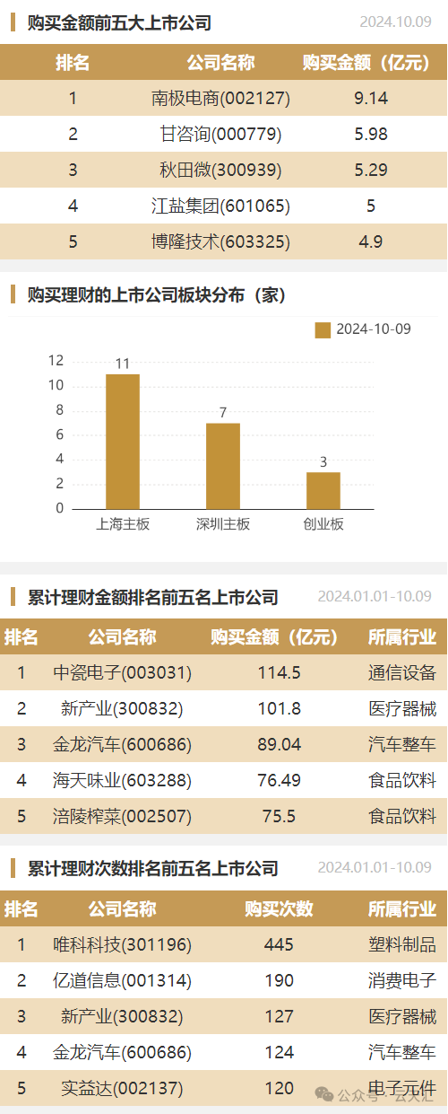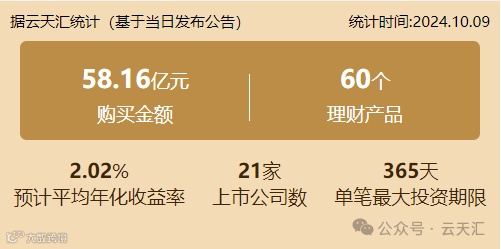 2024年10月9日,上市公司购买理财金额58.16亿元,共21家上市公司,理财产品60个。