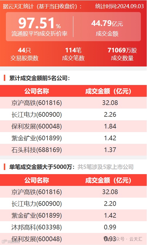 2024年9月3日,大宗交易成交金额44.79亿元,交易股票数44只,成交笔数114笔,流通股平均成交折价率97.51%,成交数量7.1亿股。