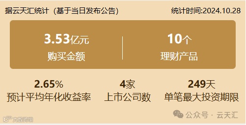 2024年10月28日,上市公司购买理财金额3.53亿元,共4家上市公司,理财产品10个。