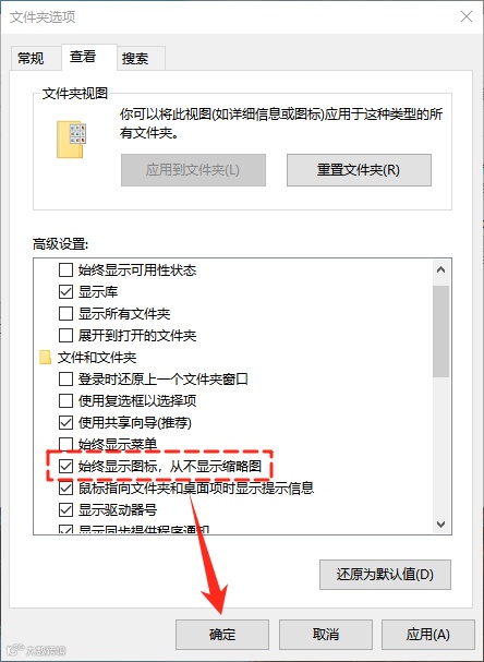 2.在弹出的窗口中,切换到【查看】选项卡,在高级设置列表中找到并勾选【始终显示图标,从不显示缩略图】选项,然后点击【确定】保存。