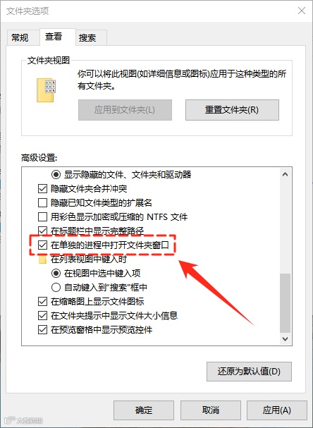 1.开启【在单独的进程中打开文件夹窗口】,提高稳定性;