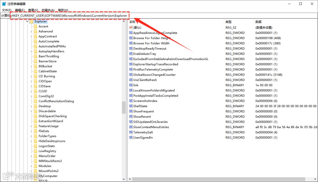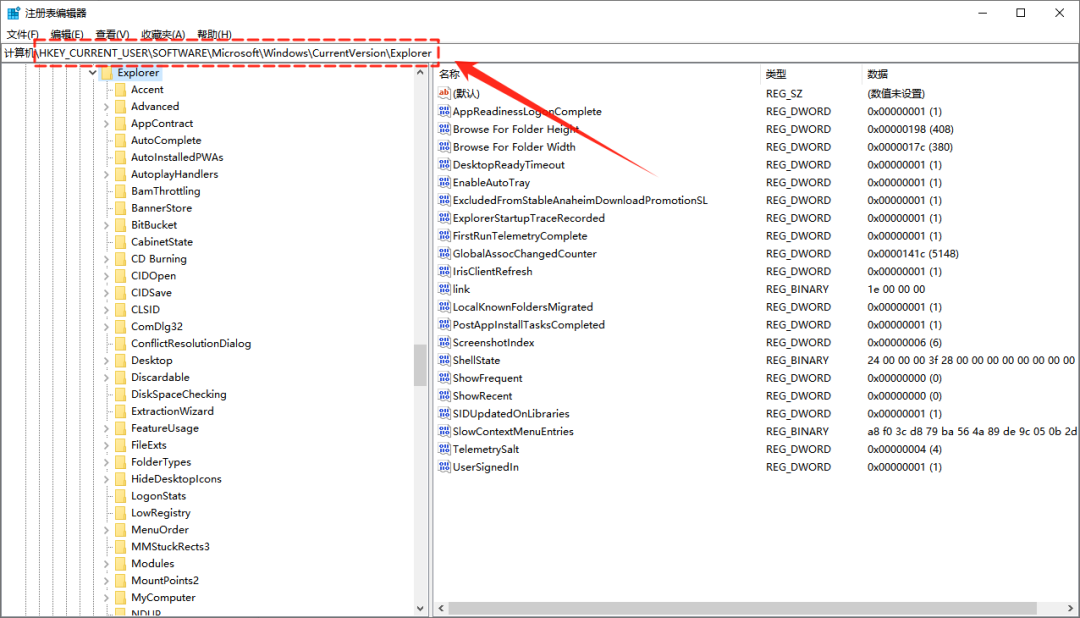 2.定位到【HKEY_CURRENT_USER\Software\Microsoft\Windows\CurrentVersion\Explorer】;