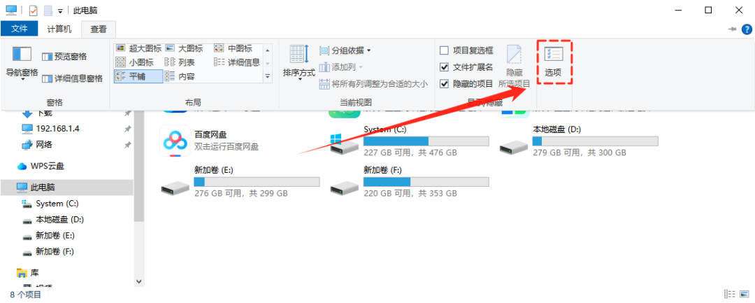 1.同样地点击文件资源管理器顶部菜单栏中的【查看】选项,然后点击最右侧的【选项】按钮;