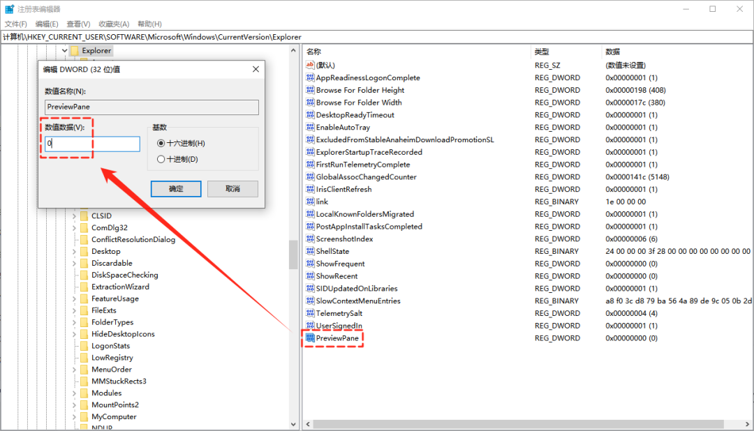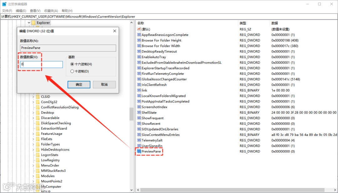 3.在右侧列表中找到或新建一个名为“PreviewPane”的DWORD值,双击设置其数值数据为“0”,然后点击【确定】保存;