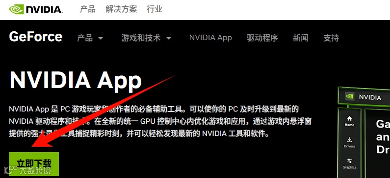 点击“驱动程序” -> “GeForce 驱动程序” -> 点击 “DOWNLOAD NOW” 下载 “NVIDIA GeForce Experience” 这个软件。安装并打开它后,它可以自动为你检测显卡型号并下载最适合的最新驱动,这个驱动包会自动包含控制面板。