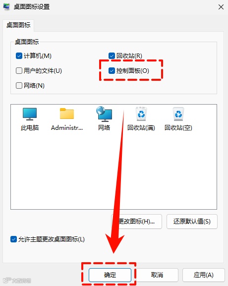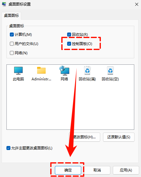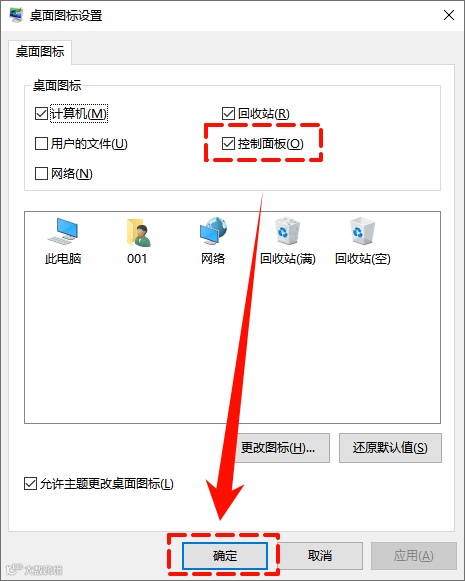Step3:桌面图标设置页面,勾选“控制面板”,点击“确定”。即可在电脑桌面看见控制面板的快捷打开方式。