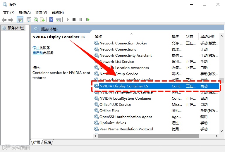 Step2:在服务列表中空白处,点击“N”,找到“NVIDIA Display Container LS”。双击它,确保它的“启动类型”是“自动”,并且“服务状态”是“已启动”。如果不是,请设置好。