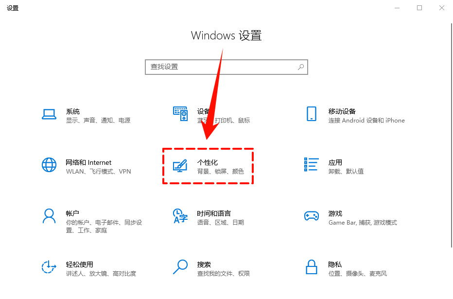Step1:同样快捷方式Win+i调出电脑“设置”页面。点击“个性化”选项。