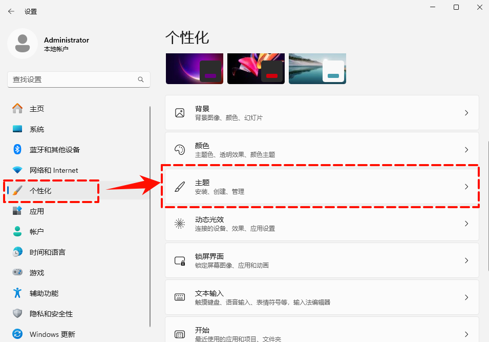 Step1:电脑Windows 10升级Windows 11后,桌面没有显示控制面板图标。快捷键Win+I,唤出电脑“设置” → “个性化” → “主题”。