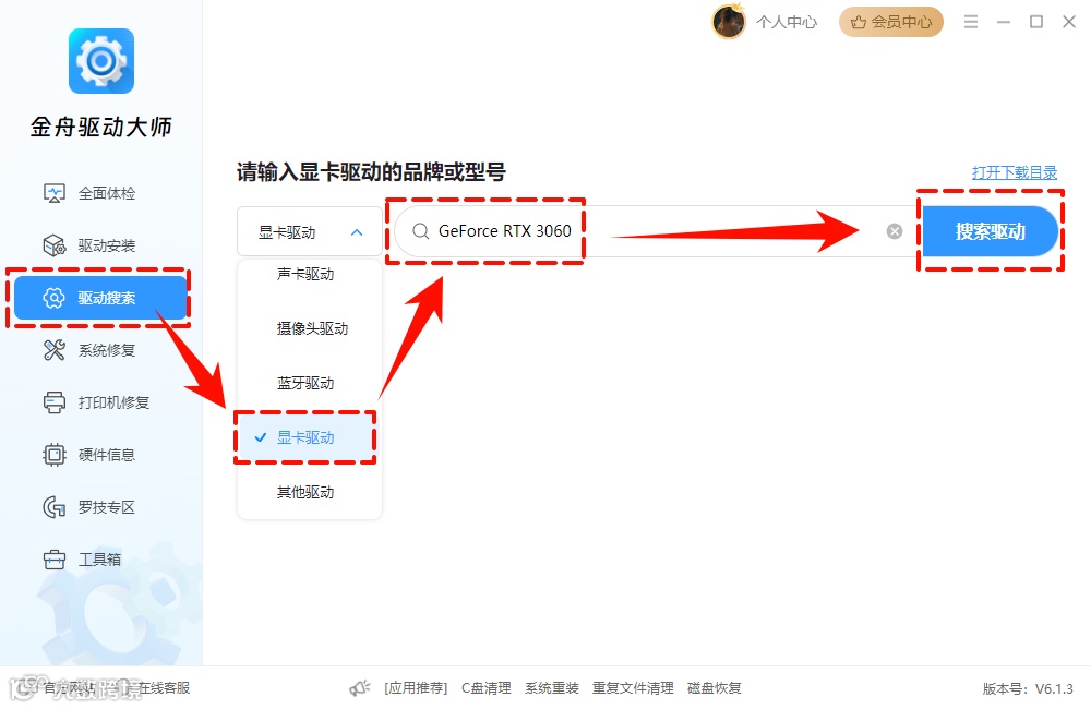 ✅3.3.1 下载安装金舟驱动大师官方正版,点击软件页面的“驱动搜索” → “显卡驱动”,在搜索框中输入显卡型号:GeForce RTX 3060,点击“搜索驱动”。