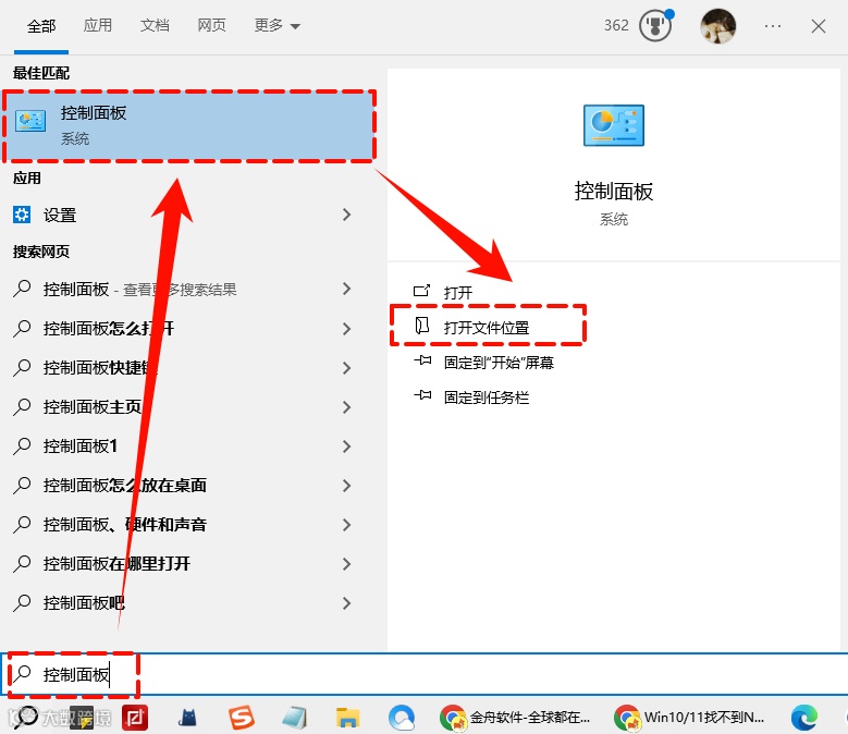 Step1:点击桌面左下角的“搜索(图标)”,在搜索框中输入“控制面板”,并点击“打开文件位置”。