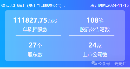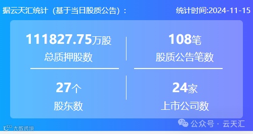2024年11月15日,股票质押总质押股数11.18亿股,上市公司数24家,股质公告笔数108笔,股东数27个。