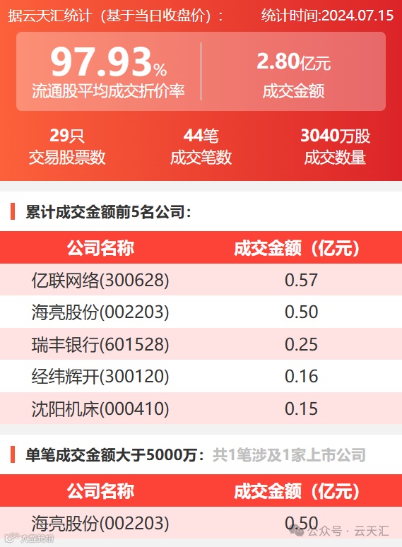 2024年7月15日,大宗交易成交金额2.8亿元,交易股票数29只,成交笔数44笔,流通股平均成交折价率97.93%,成交数量0.3亿股。