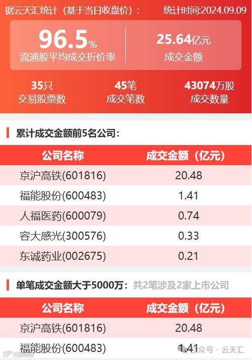 2024年9月9日,大宗交易成交金额25.64亿元,交易股票数35只,成交笔数45笔,流通股平均成交折价率96.5%,成交数量4.3亿股。