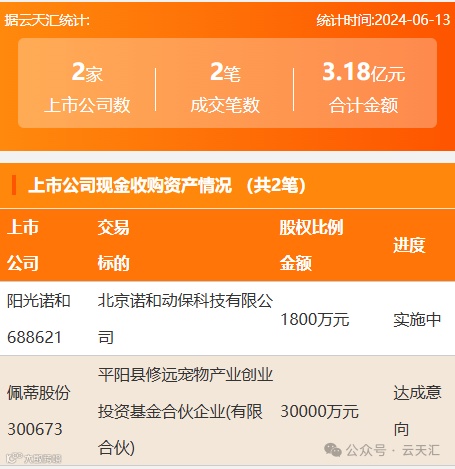 2024年6月13日,资产交易成交金额3.18亿元,上市公司2家,成交2笔,上市公司现金收购资产2笔。