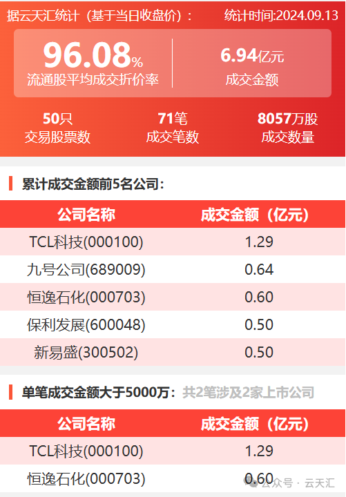 2024年9月13日,大宗交易成交金额6.94亿元,交易股票数50只,成交笔数71笔,流通股平均成交折价率96.08%,成交数量0.8亿股。