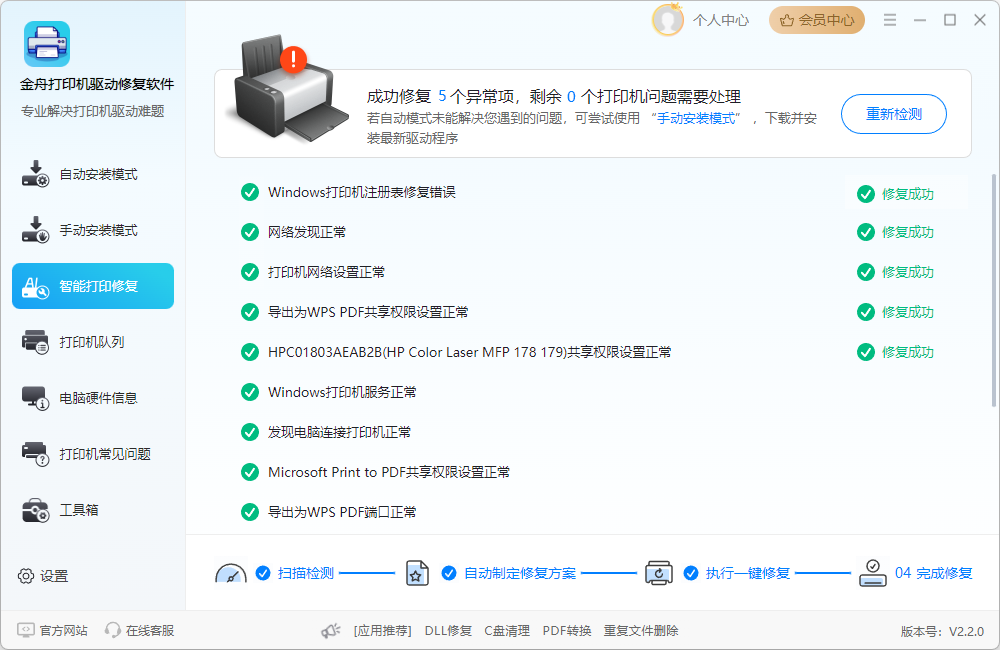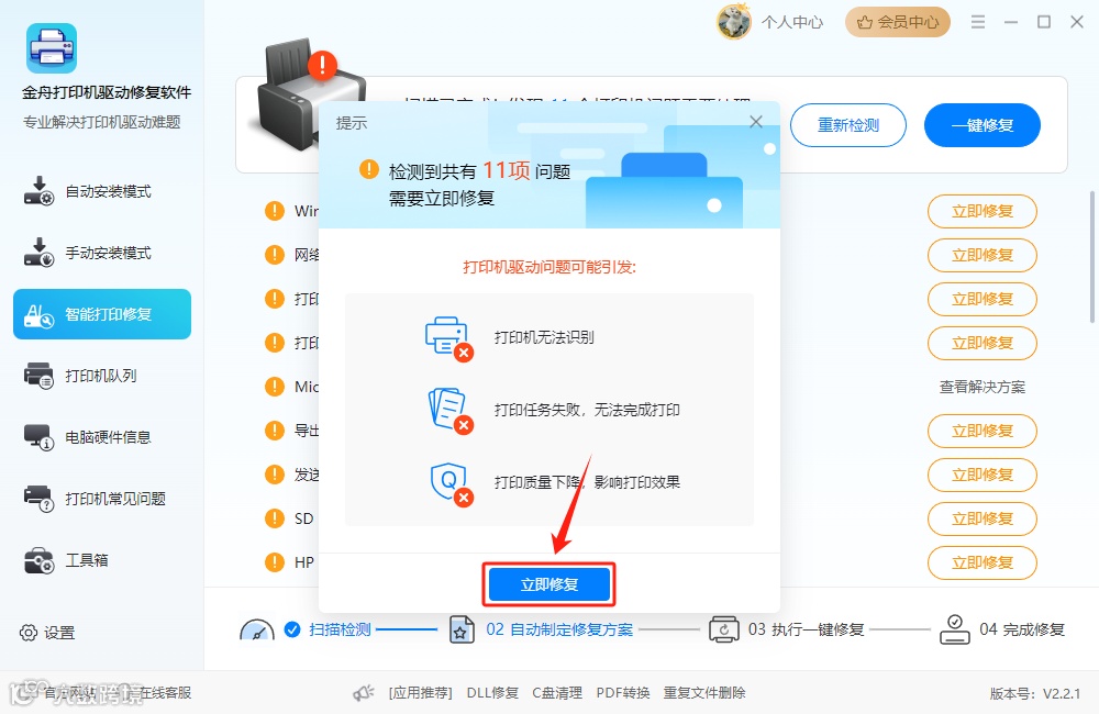 软件介绍:金舟打印机驱动修复软件是一款能够自动识别打印机品牌和型号,将驱动程序安装、打印机异常检测和修复融为一体,一键修复驱动程序的软件工具,让您轻松应对所有与打印机相关的问题,告别打印烦恼,迎接流畅体验!