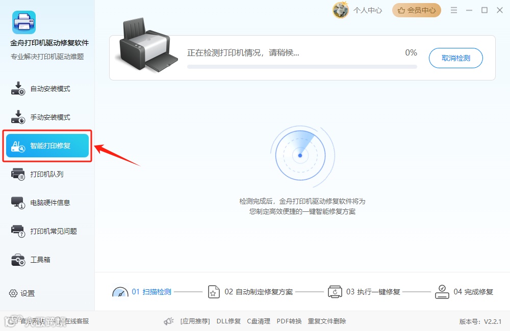 步骤一:电脑下载安装好金舟打印机驱动修复软件,双击打开软件,选择【智能打印修复】。软件会自动扫描软件。