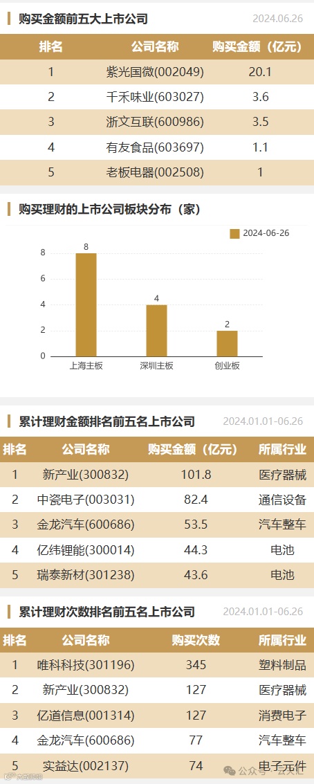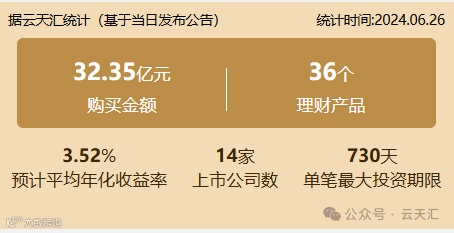 2024年06月26日,上市公司购买理财金额32.35亿元,共14家上市公司,理财产品36个。