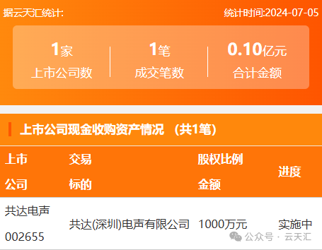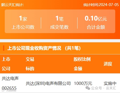 2024年7月5日,资产交易成交金额0.1亿元,上市公司1家,成交1笔,上市公司现金收购资产1笔。