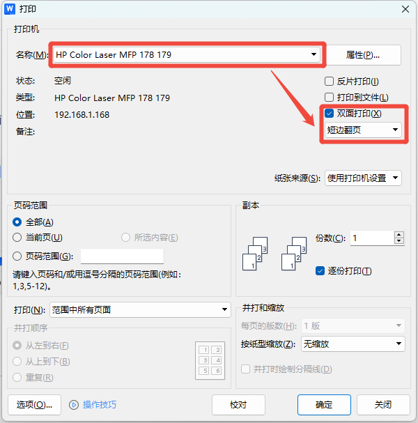 2.选择支持双面打印的打印机,勾选「双面打印」,选择长边翻转(书籍式)或短边翻转(便签式)。