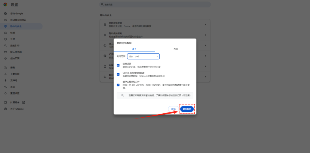 2.时间范围可选择【全部时间】,勾选【缓存的图片和文件】【浏览记录】等,点击【删除数据】;