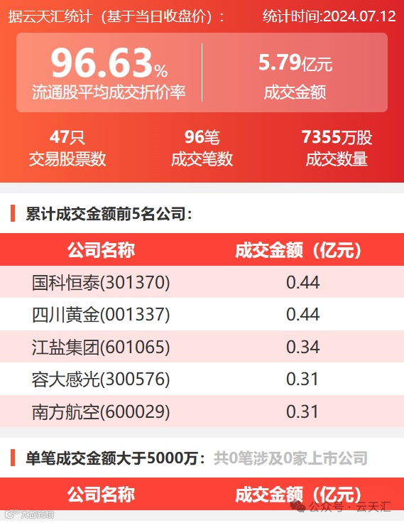 2024年7月12日,大宗交易成交金额5.79亿元,交易股票数47只,成交笔数96笔,流通股平均成交折价率96.63%,成交数量0.73亿股。