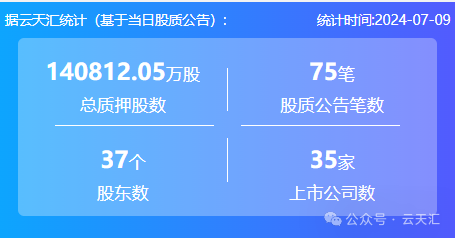 2024年7月9日,股票质押总质押股数14.08亿股,上市公司数35家,股质公告笔数75笔,股东数37个。