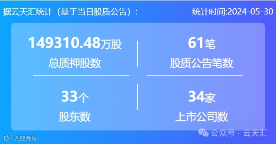 2024年5月30日,股票质押总质押股数14.93亿股,上市公司数34家,股质公告笔数61笔,股东数33个。