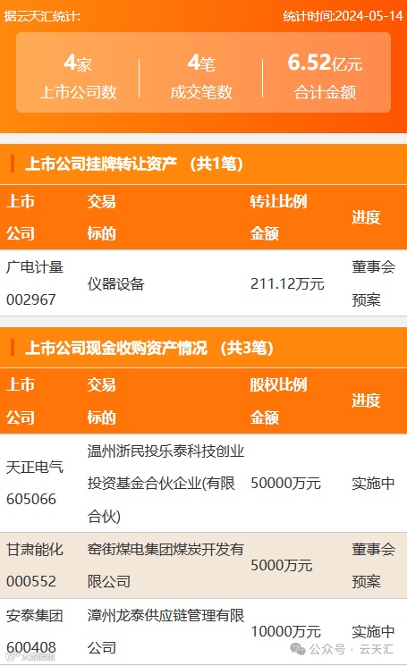 2024年5月14日,资产交易成交金额6.52亿元,上市公司4家,成交4笔,上市公司挂牌转让资产1笔,现金收购资产3笔。