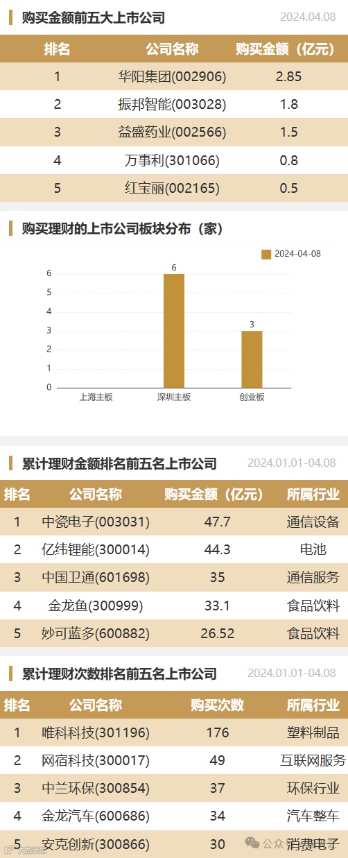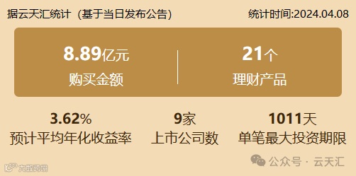 2024年04月08日,上市公司购买理财金额8.89亿元,共9家上市公司,理财产品21个,单笔最大投资期限1011天。