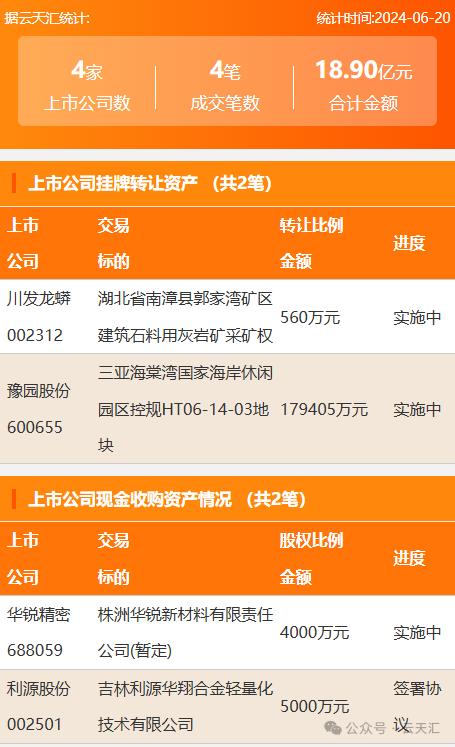 2024年6月20日,资产交易成交金额18.90亿元,上市公司4家,成交4笔,上市公司挂牌转让资产2笔,现金收购资产2笔。